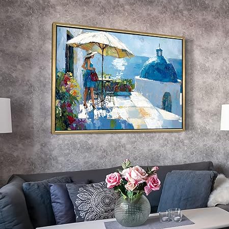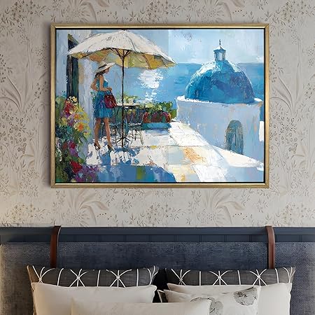 PAPER PLANE DESIGN Blue-domed café by the sea cliffs – Impasto Oil Painting – European Wall Art – Ready to Hang – Golden Frame – Living Room & Office Decor – 4ft x 3ft (DS 03)
